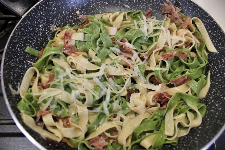 Paglia e Fieno met spek, Parmezaan en pistachenoten, met zelfgemaakte verse eierpasta, heerlijk en gemakkelijk te bereiden. Een smakelijk hoofdgerecht, perfect voor een familielunch of een avondje met vrienden.