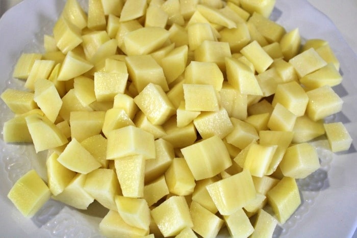 Schil ondertussen de aardappelen, was ze en snijd ze in blokjes van ongeveer 1,5 – 2 cm.
