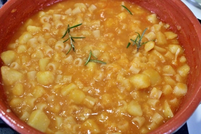 Voeg vervolgens 1 pollepel heet water toe en voeg de verschillende pasta toe (ik gebruikte ditali), en kook tot het gaar is. Voeg naar smaak de rozemarijn toe.