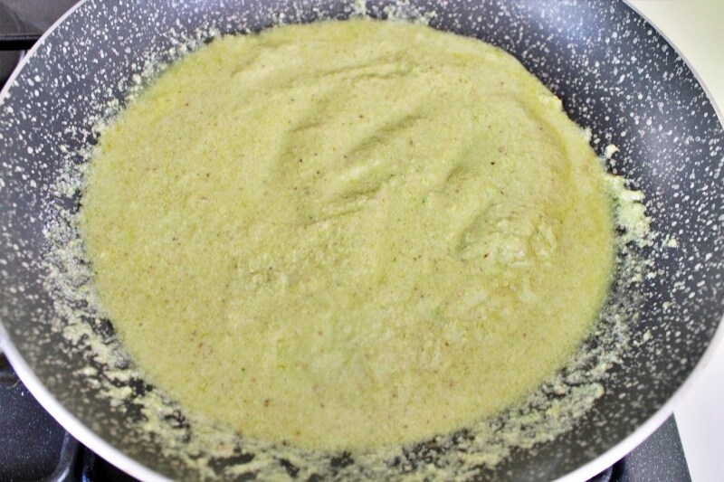 Zet nu een grote koekenpan op het vuur, voeg de tuinbonenpesto toe (in de gewenste hoeveelheid) en een pollepel kookwater: meng goed om de saus romiger te maken.