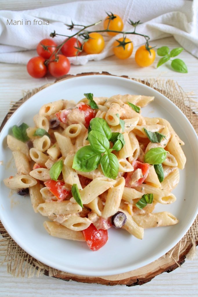 Voeg de philadelphia-crème toe aan de pasta, meng goed, voeg vervolgens de uitgelekte tonijn toe en tenslotte de cherrytomaatjes en olijven. Werk af met verse basilicumblaadjes en serveer direct of bewaar in de koelkast tot gebruik.