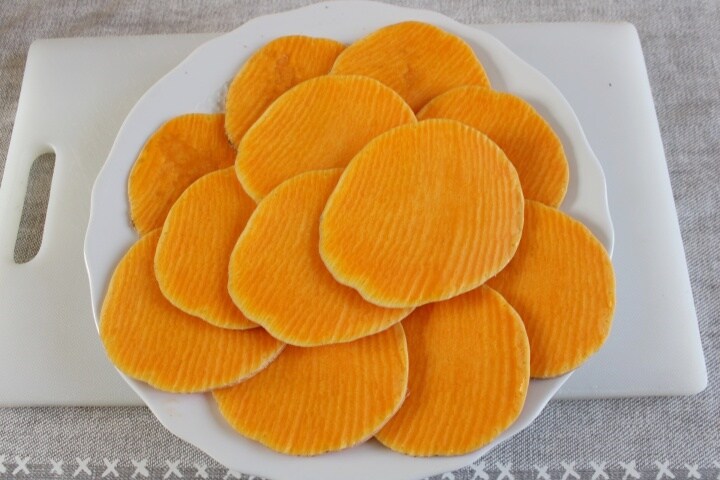 Maak eerst de pompoen goed schoon, verwijder de steel en snijd de pompoen met een scherp mes of met de snijmachine in plakjes van ongeveer 0,3 – 0,5 cm dik, verwijder dan de schil.
