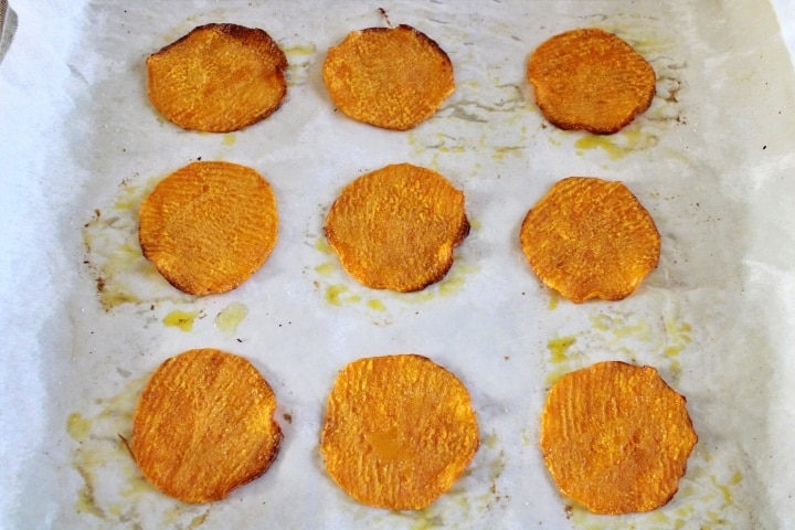 Bedek een bakplaat met bakpapier en leg de plakjes pompoen op een afstand van elkaar, besprenkel ze met een beetje extra vergine olijfolie, een beetje zout en bak ze in de voorverwarmde oven gedurende ongeveer 20 minuten. Controleer af en toe de kooktijd: ze moeten een mooie goudbruine kleur hebben.