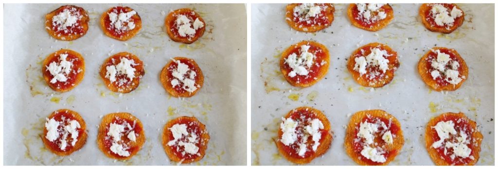 Zodra de pompoen gaar is, haal deze uit de oven en beleg met de saus, de mozzarella, oregano, een snufje Parmezaanse kaas en een paar stukjes ansjovis (of ansjovispasta, voor een beetje ziltigheid). Ik legde kleine stukjes onder de mozzarella (wat ik niet allemaal moet doen om mijn kinderen te laten eten :D). Zet opnieuw in de oven tot de mozzarella gesmolten is en serveer warm.