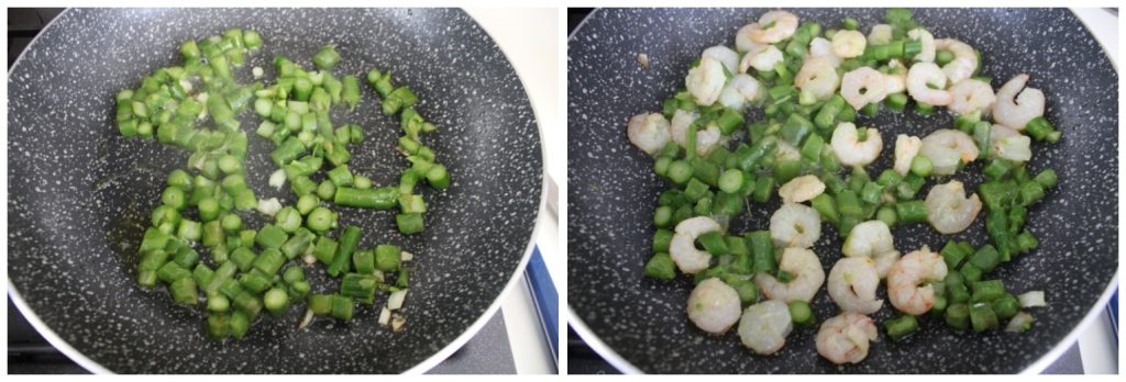 • Fruit in een pan de fijngehakte ui in extra vierge olijfolie, voeg de in stukjes gesneden asperges (bewaar de toppen apart) en de garnalen toe. Zodra het klaar is, voeg je de rijst toe en rooster je die.