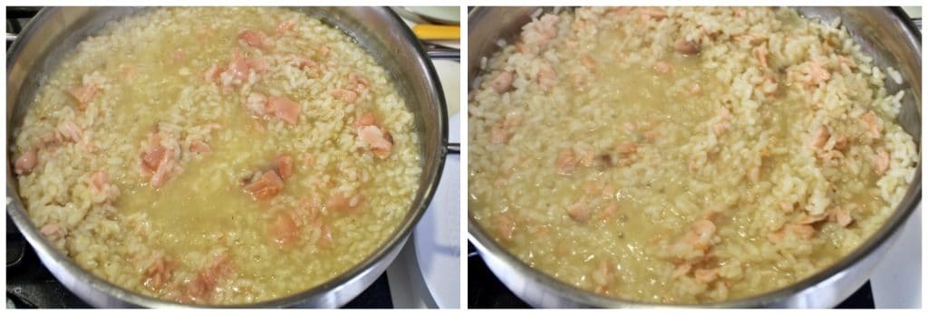 Halverwege de kooktijd, voeg de in stukjes gesneden gerookte zalm toe, meng goed: indien nodig, voeg een soeplepel hete bouillon toe.