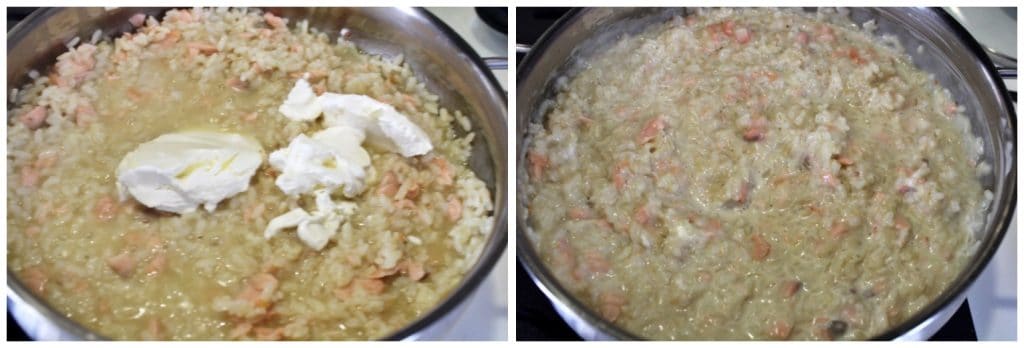 Wanneer de rijst bijna gaar is, voeg je de verse kaas toe. Ik heb Philadelphia gebruikt, maar ook stracchino is perfect voor een romige textuur. Meng goed met een houten lepel totdat de kaas volledig is gesmolten.