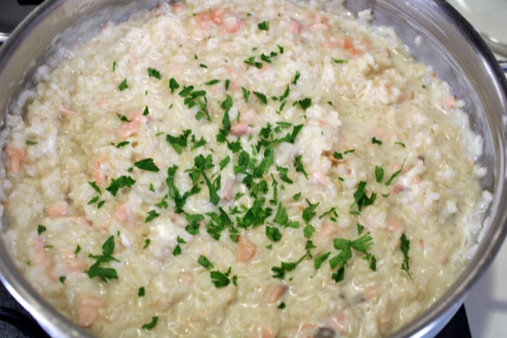 Hier is de Romige Risotto Zalm en Kaas klaar. Serveer warm en … eet smakelijk!