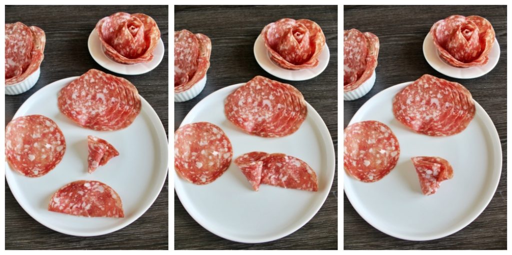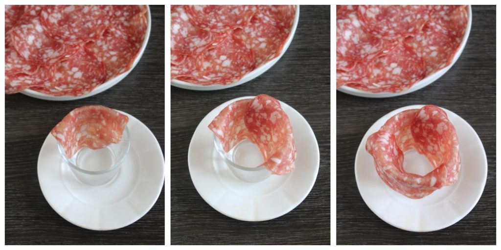 Wat je nodig hebt, zijn plakjes salami, een glas en een kommetje. Makkelijk, toch?