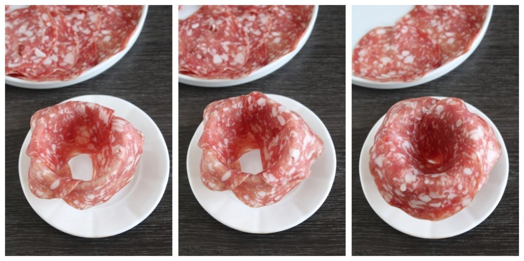 Neem nu een kommetje (de mijne heeft een diameter van 6 cm), leg de plakjes salami rondom, de ene half overlappend aan de andere, maar deze keer zonder ze eruit te trekken. In totaal 5 (of 4, zoals je wilt).