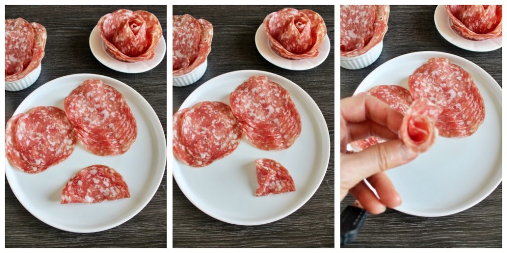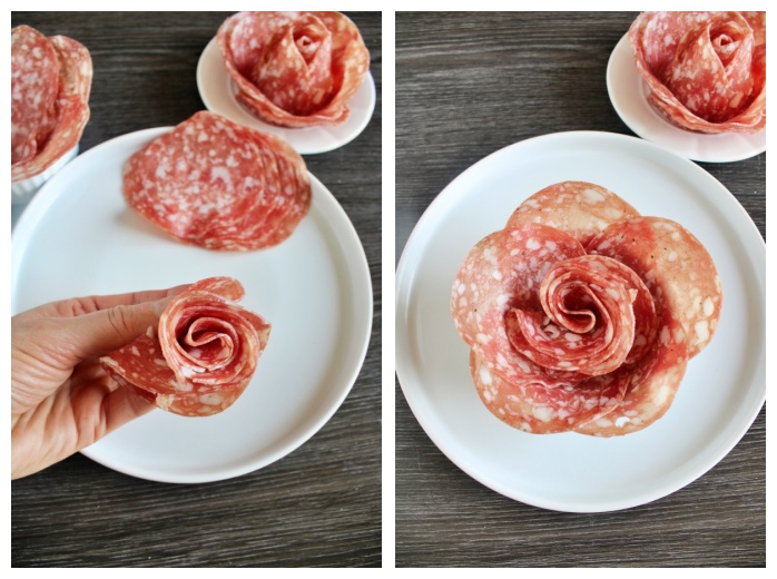Op dit punt, plaats de uiteindelijke knop in het kommetje met de andere plakjes salami en de roos is klaar.