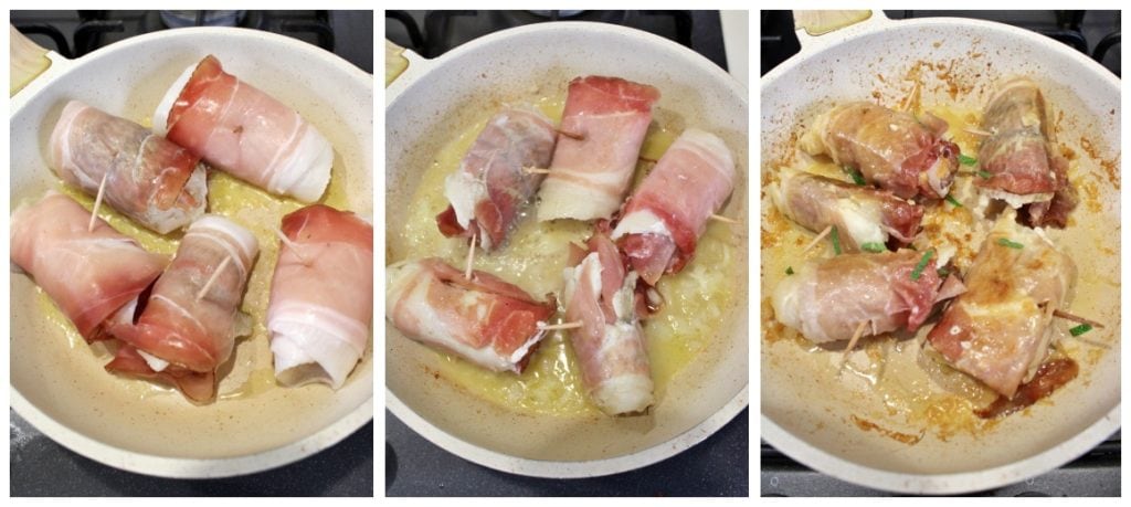 Het recept is heel eenvoudig en snel. Ik heb de speck uitgespreid, bedekt met de scholfilets en de salie, en vervolgens opgerold tot rolletjes. Ik heb ze in de pan laten koken met witte wijn, gesnipperde ui en een eetlepel bloem. Het is praktisch de visversie van saltimbocca, een beetje herzien.
