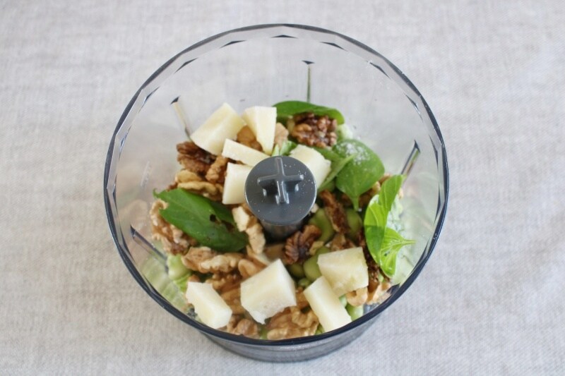 • Doe in een mixer of blender de tuinbonen, de pecorino, de parmezaan, de walnoten (of de pijnboompitten, amandelen ..), de knoflook (zonder het binnenste), de basilicum (of de munt), en het zout. Begin te mengen en voeg de extra vergine olijfolie toe totdat u een homogene room krijgt.