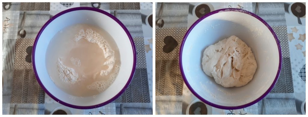 Allereerst doe je de meel in de kom van de planetaire mixer (of in een kom), voeg 250 g water toe en meng met een vork; laat ongeveer 1 uur rusten.