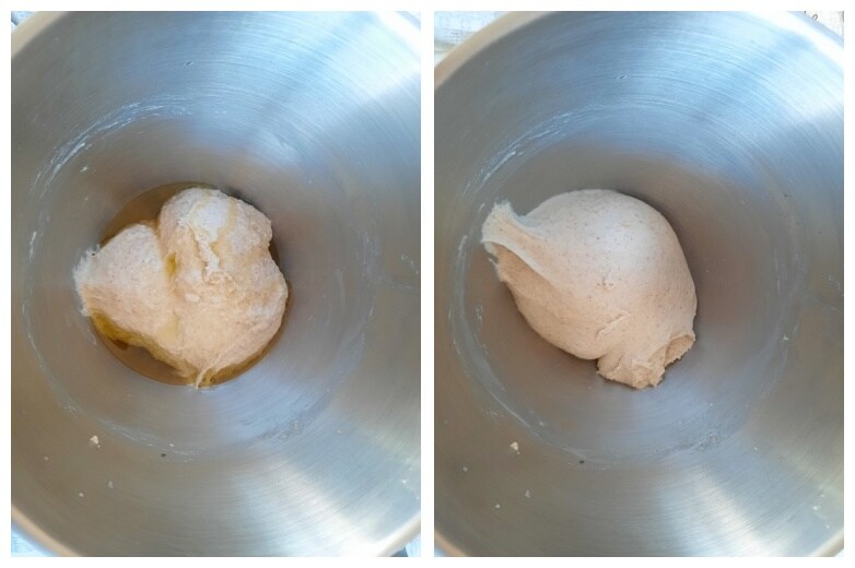 Terwijl het kneedt, voeg de extra vergine olijfolie en het zout toe: laat de olie goed opnemen.