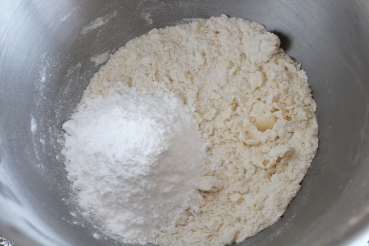 • Snijd het in stukjes en doe het in de kom van de planeetmenger samen met de bloem en begin snel te kneden met de k-haak. Werk ze kort, net genoeg om een zanderig mengsel te krijgen.
