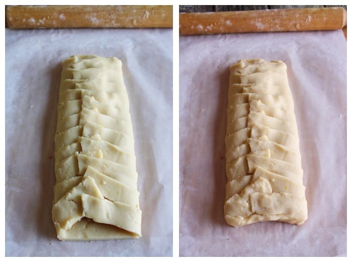 Leg vervolgens het deeg van het zandtaartdeeg op een vel bakpapier en rol het uit met een deegroller tot een rechthoek van ongeveer 0,5 – 0,8 cm dik. Als je merkt dat het de neiging heeft om te kruimelen, kneed het dan een beetje met je handen voordat je het uitrolt.