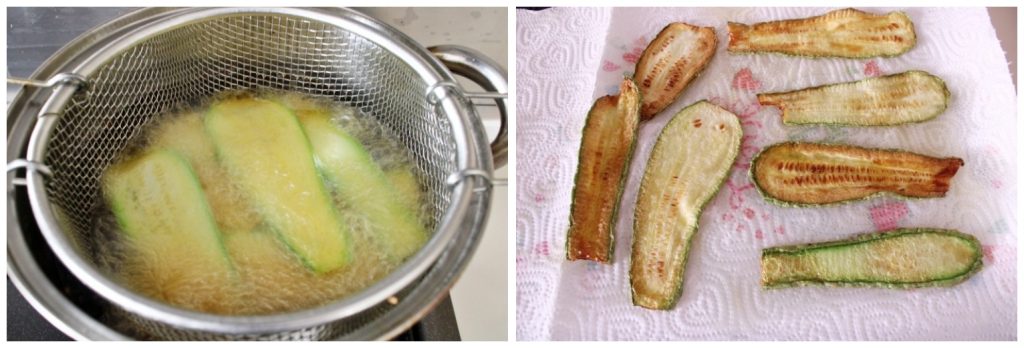 Zodra ze klaar zijn, droog je de courgettes met keukenpapier en bak ze in hete olie in een pan (of in een specifieke frituurpan met stalen mand, ideaal voor eenvoudig en snel frituren), leg ze dan op een bord bedekt met keukenpapier zodra ze klaar zijn.
