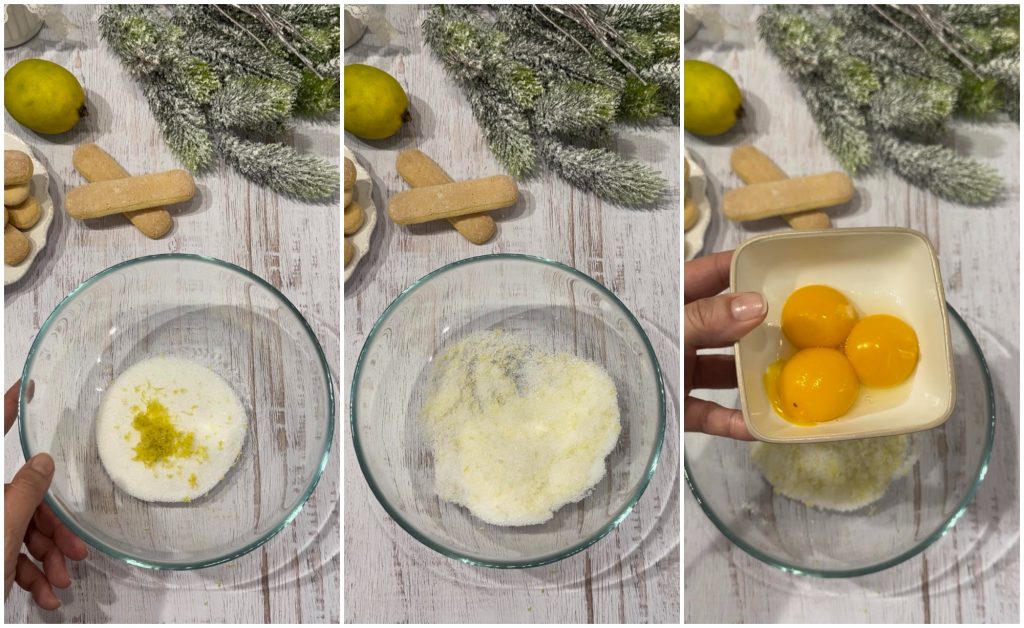 Meng de suiker en de citroenschil met je vingers om alle geuren vrij te laten en de suiker aromatisch te maken.