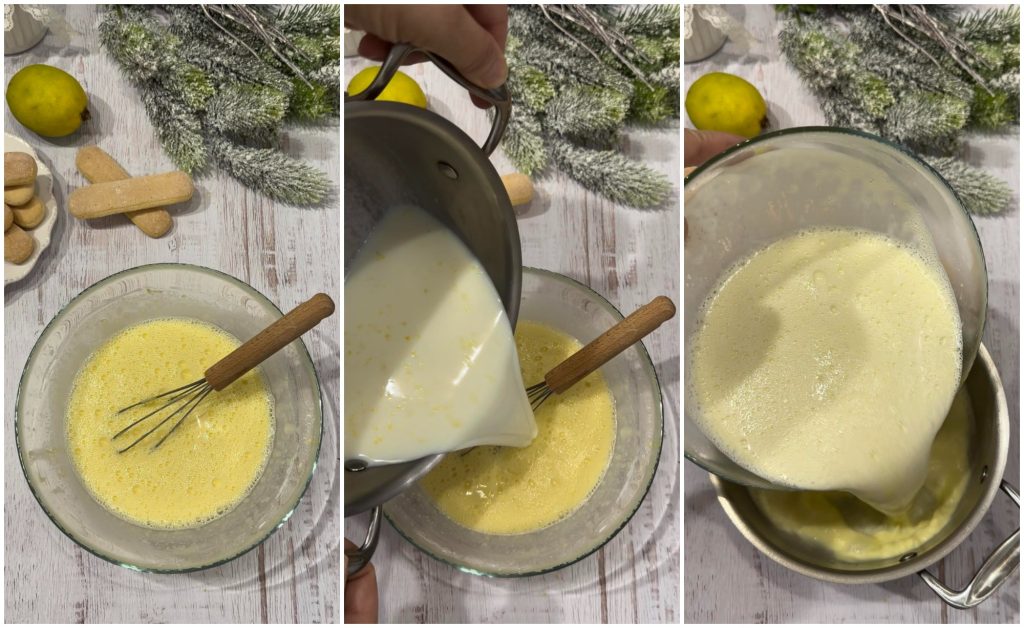 Wanneer de melk heet is geworden (maar NIET kokend) giet het dan over de gemonteerde eieren en suiker en meng onmiddellijk met de garde.