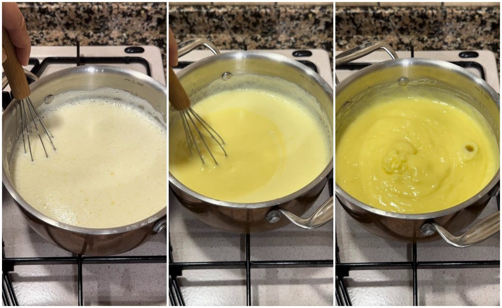We beginnen met de banketbakkersroom die daarna lichtjes moet afkoelen voordat we de taart samenstellen.