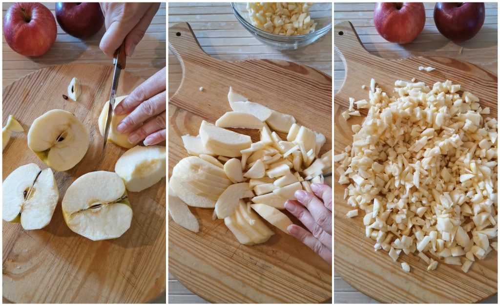 Op dit punt kunnen we de appels in kleine blokjes snijden en, indien mogelijk, van gelijke grootte.