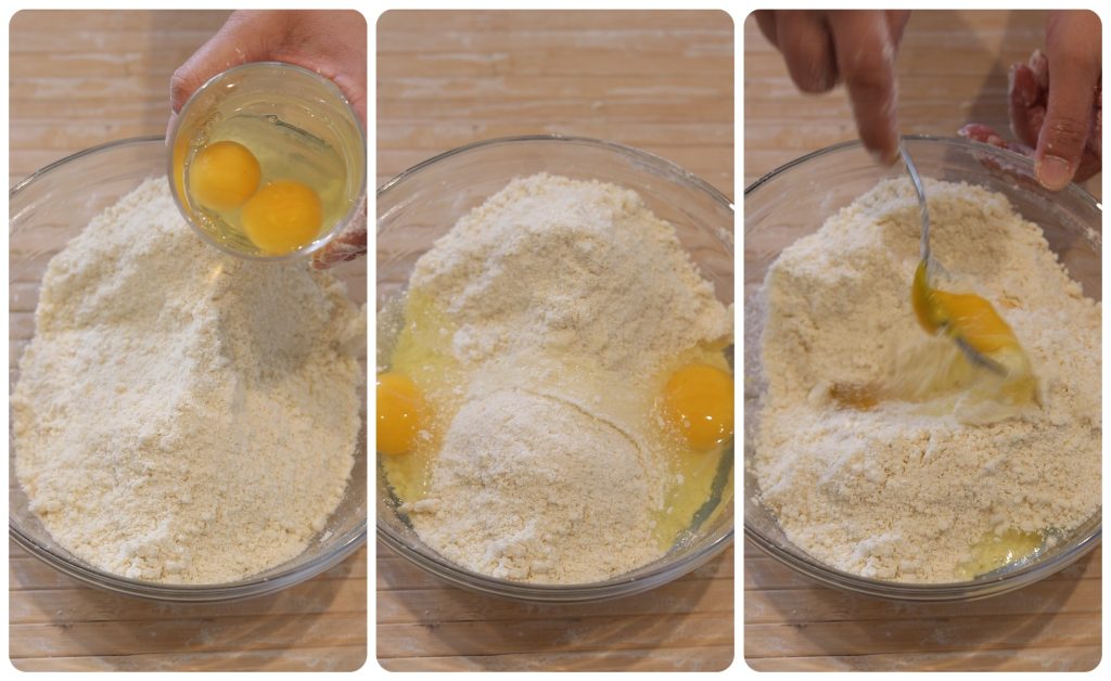 • Vervolgens blijf je het deeg met je handen kneden zodat de vloeistoffen de droge ingrediënten opnemen.