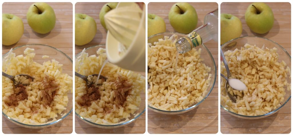 • We beginnen met de appels. Was ze, schil ze, snijd ze in kleine blokjes en plaats ze in een kom.