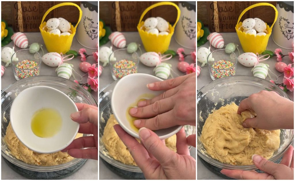• Nu moeten we de koekjes vormen! Doe een eetlepel zaadolie of olijfolie in een klein kommetje. Maak je vingers nat en neem een stuk deeg.