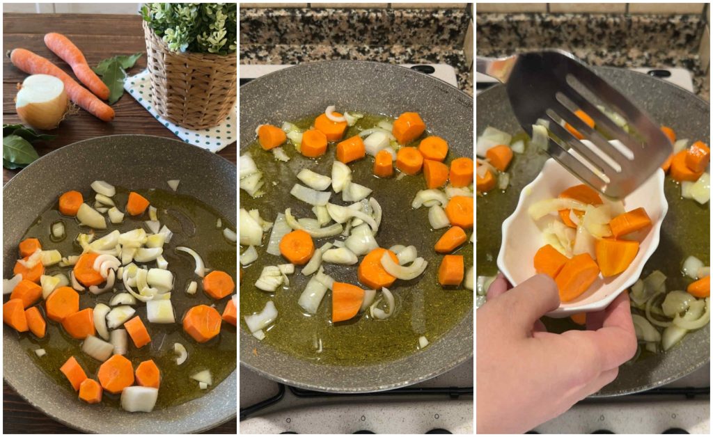 Snijd de wortelen in stukken en de ui in dunne partjes.