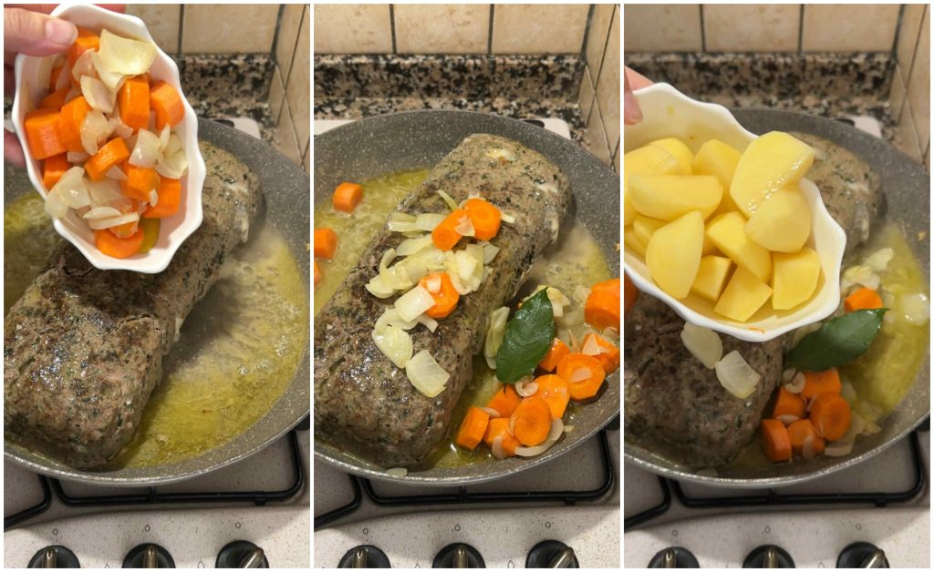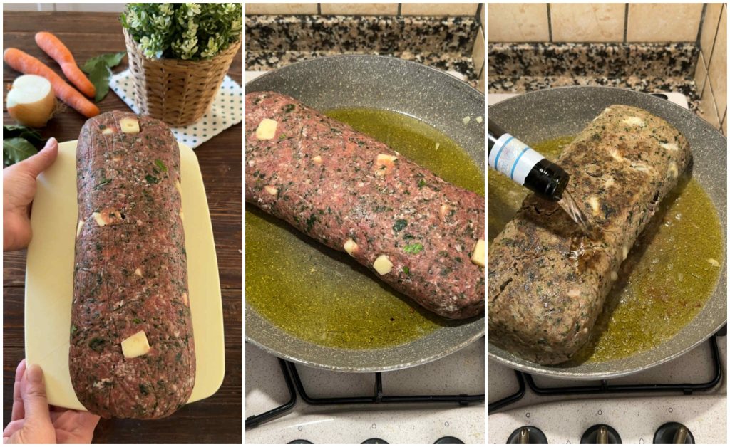 Leg in dezelfde pan het gehaktbrood en laat het goed aan alle kanten bruin worden. Deze fase is essentieel om het vlees te verzegelen en te voorkomen dat het uitdroogt.