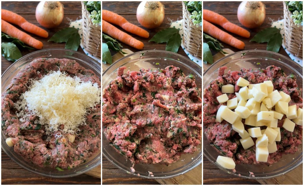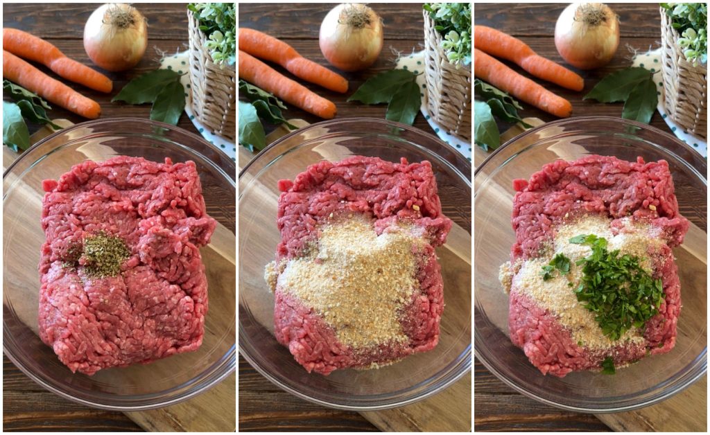 Voeg de eieren, paneermeel, fijngehakte knoflook toe als je daarvan houdt, Parmezaanse kaas, zout, peper en fijngehakte verse peterselie.