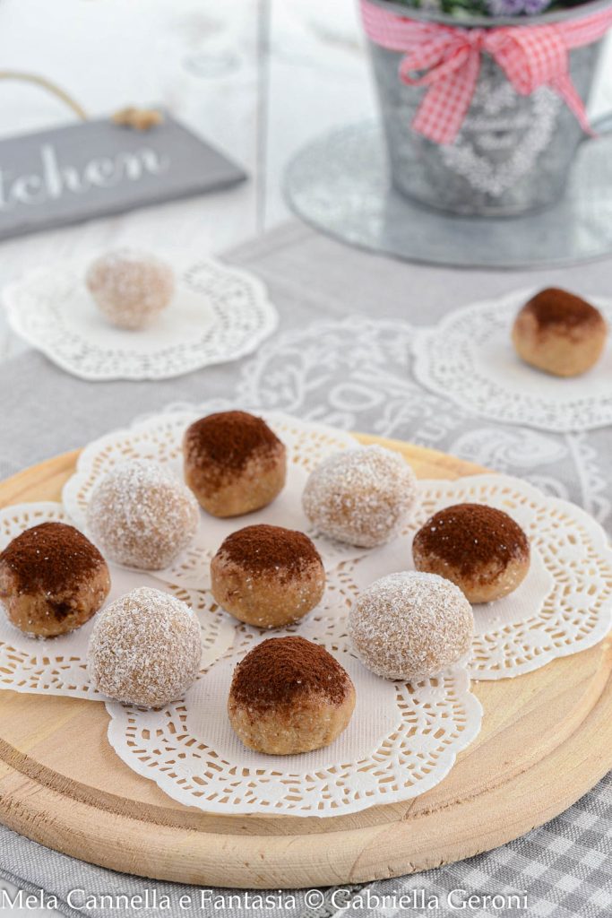 Vorm met je handen balletjes (kies de maat die je wilt) en bestrooi de helft met cacaopoeder en haal de andere helft door de kokosmeel.