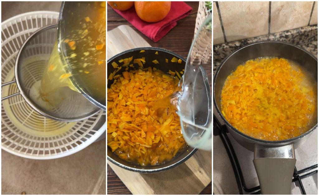 Terwijl je marmelade kookt, neem je de gesneden schillen en doe je ze in een klein pannetje.