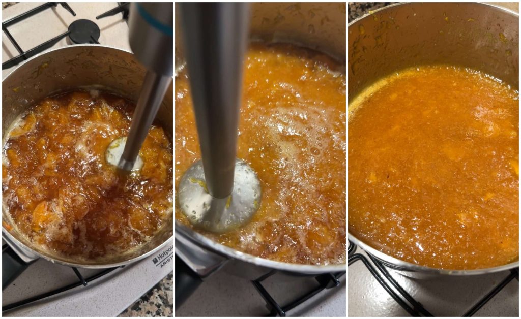 Als je marmelade klaar is (je moet het ongeveer 2,5 uur laten koken, zie onderaan hoe je kunt controleren of het klaar is), pureer het met de staafmixer om het homogener te maken.