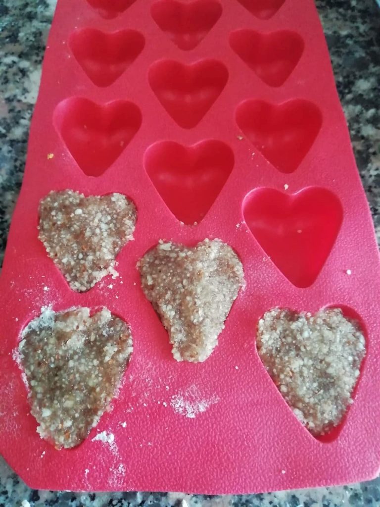 Kneed het mengsel met je handen en gebruik een koffielepel om een portie te nemen. Vorm kleine balletjes of, zoals ik deed, geef ze een hartvorm in een siliconen mal.
