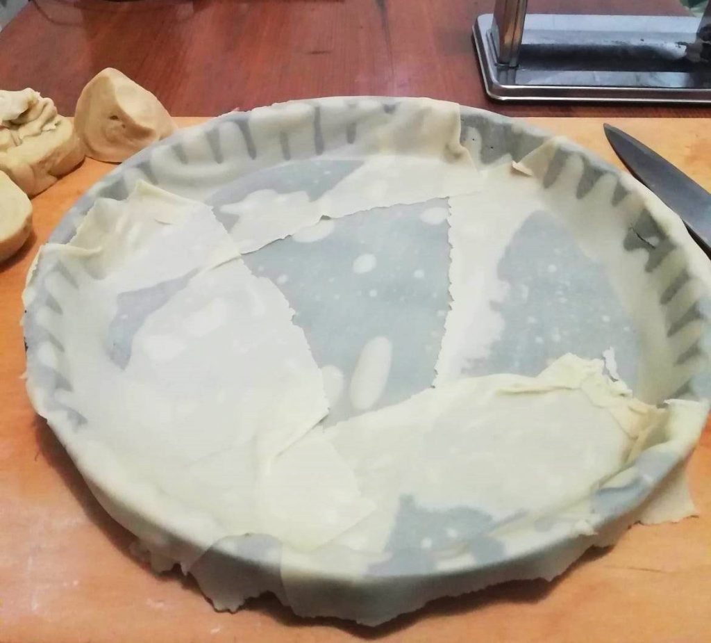 Vet een bakvorm van 24-26 cm in diameter en bekleed deze met de vellen tot aan de rand.