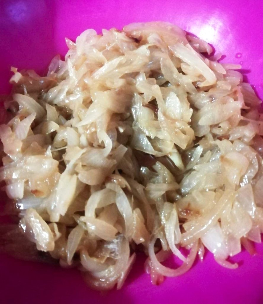 Intussen schil de uien en snijd ze in dunne plakjes. Doe de olie en de uien in een pan, bevochtig ze met water, een snuifje zout en een snufje zwarte peper, en fruit ze tot ze zacht en droog zijn. Breng ze na het koken over in een kom.