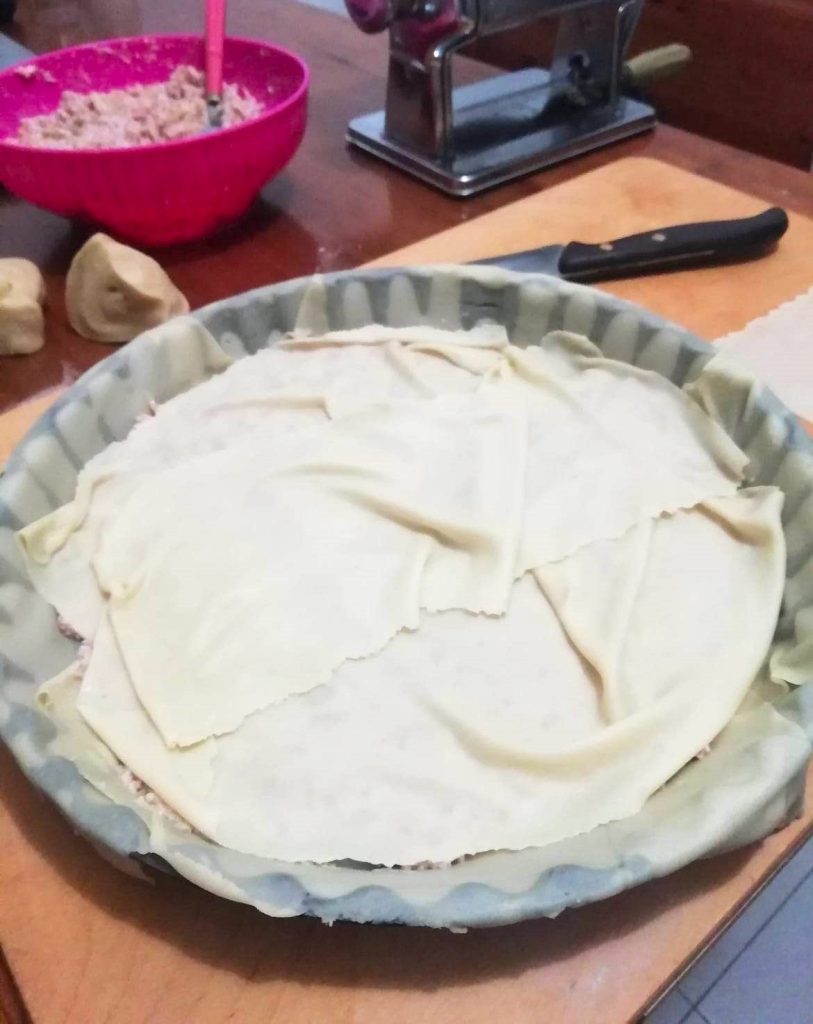 Ga door met het vullen van de bladerdeeg pizza tot de 4e laag vulling en eindig dan met de laatste van bladerdeeg.