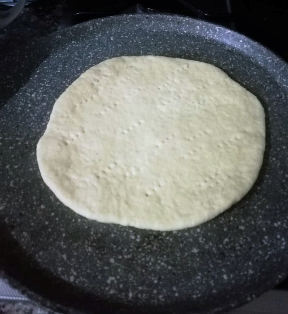Neem een bolletje deeg, rol het uit, vorm er een cirkel van en leg het op de hete plaat. Prik vervolgens met een vork her en der in de pizzillo.