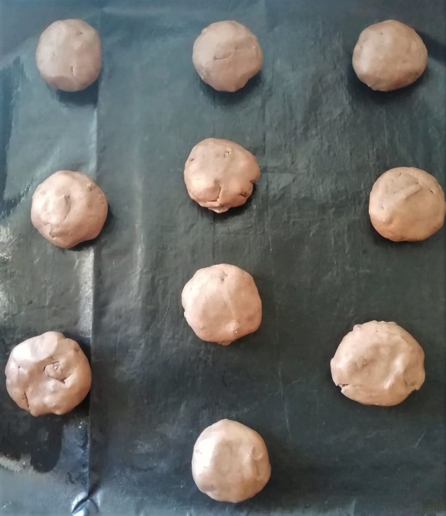Vorm ballen van 40 gram elk met het deeg om grote koekjes te maken, of als je kleinere koekjes wilt, weeg dan 25-30 gram deeg. Plaats ze op een bakplaat en laat 6 centimeter tussenruimte.