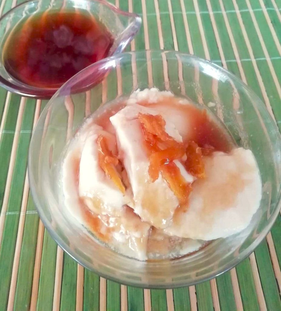 De douhua met gembersiroop is een delicate tofu-pudding, extra zacht en zijdeachtig, op basis van sojamelk, en wordt geserveerd als licht dessert in de Aziatische keuken. De naam is een afkorting van dou fu hua, wat in het Chinees tofu-bloem betekent, en de versie die ik het lekkerst vind, is koud met het gembersiroop, maar ik hou er ook van als het warm is in de miso-soep.