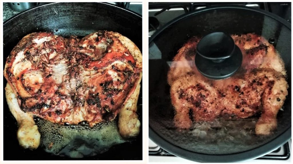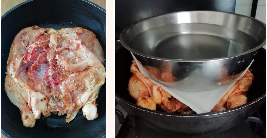 • Na de marinadetijd neem je een grote antiaanbakpan met randen en leg je de kip met de huid naar beneden. Leg er een vel bakpapier en een gewicht bovenop om de kip tijdens het bakken plat te houden. Ik gebruik een pan gevuld met water of een metalen kom.