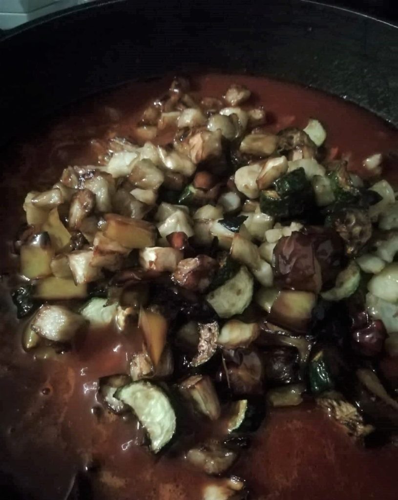 De aubergine caponata is klaar. Laat het een beetje afkoelen voordat je het warm serveert, of laat het volledig afkoelen als je het koud wilt serveren.
