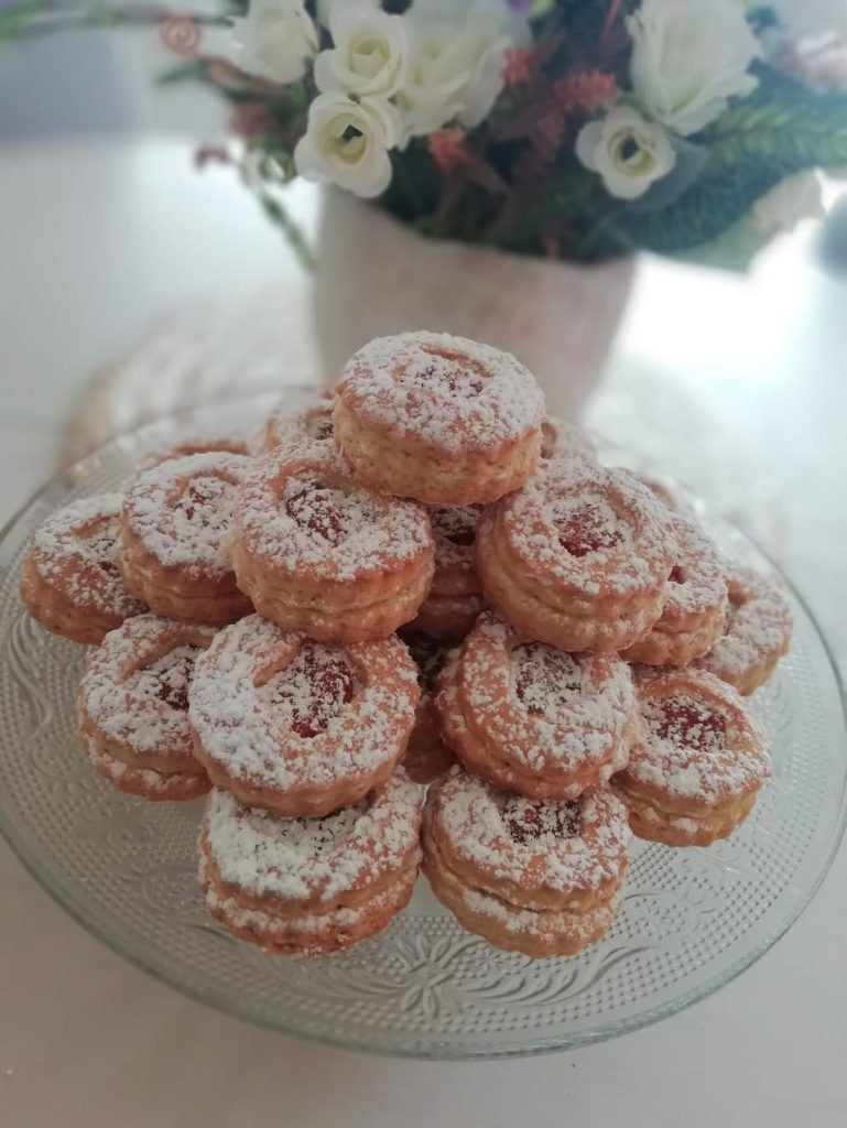 • Leg een halve theelepel jam in het midden van het koekje. Steek andere schijven uit het deeg, deze keer met een gat in het midden. Snijd ze uit met een kleinere vorm. Leg het tweede koekje op het eerste.