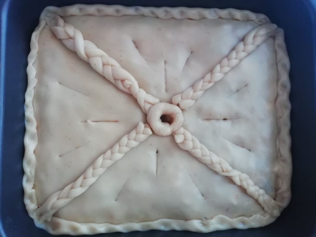 • Rol het tweede deel uit, de kleinere voor de afdekking, en vorm een andere rechthoek. Bedek de taart en sluit de randen met je vingers. Maak een gat in het midden en versier de empanada met het overgebleven deeg. Maak strepen die vanuit de vier hoeken naar het midden komen. Bestrijk tenslotte het oppervlak met een losgeklopt eigeel.