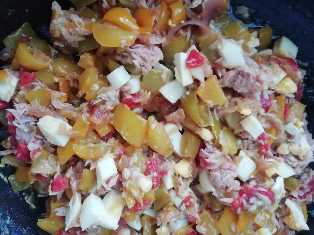 • Wanneer de groenten al hun vocht hebben opgenomen en droog zijn, voeg de tonijn en de hardgekookte eieren toe. Meng alle ingrediënten een paar minuten, proef en voeg indien nodig extra zout toe. Zet het vuur uit en laat afkoelen.