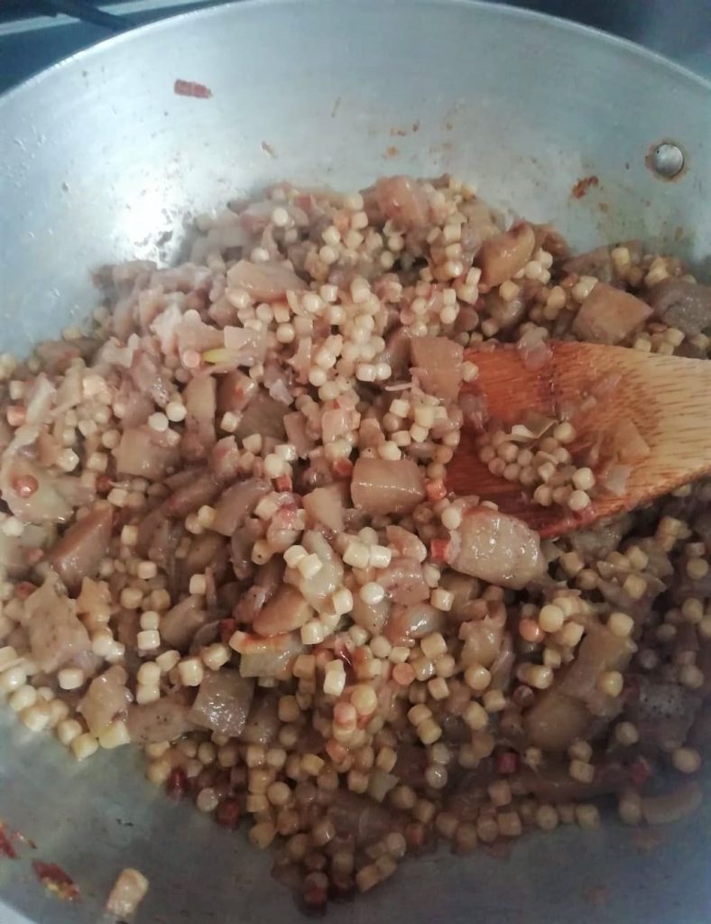 • Braad de fregola met de aubergines 3 minuten aan, terwijl je voortdurend roert met een houten lepel.