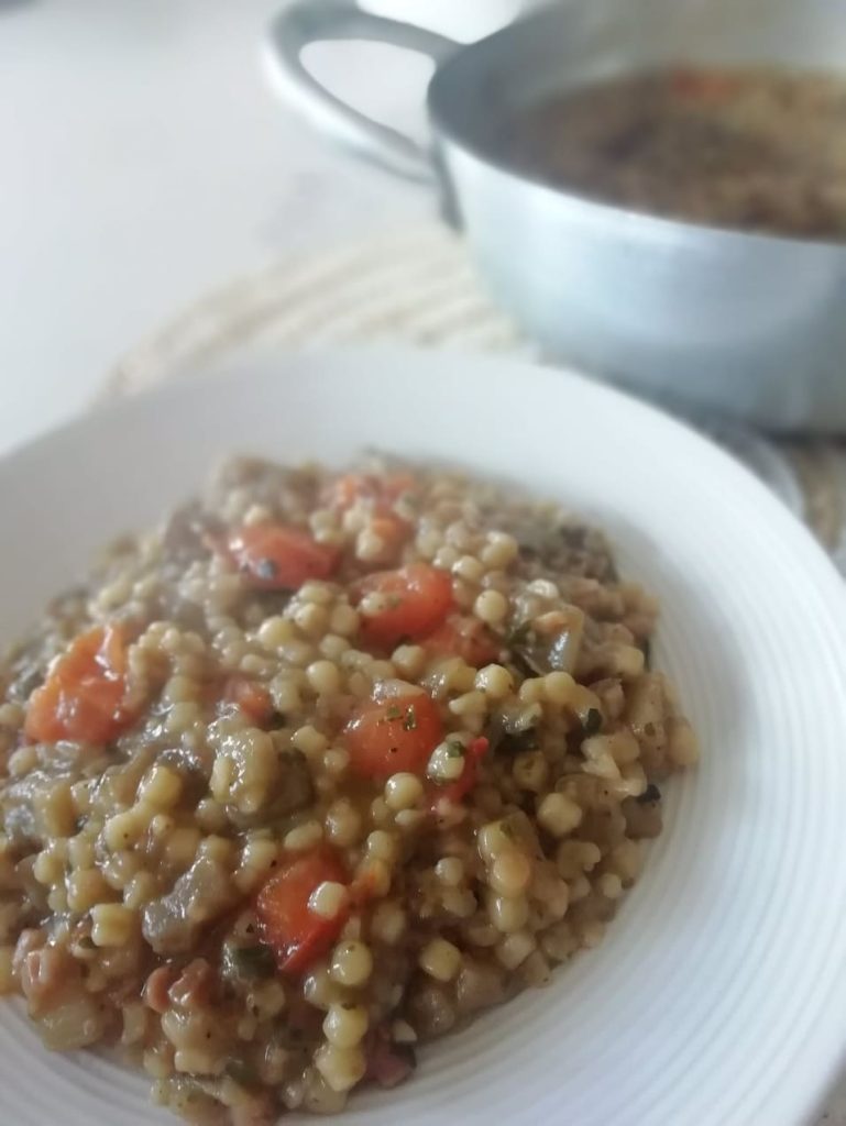 FREGOLA MET AUBERGINE, cherrytomaatjes en basilicum