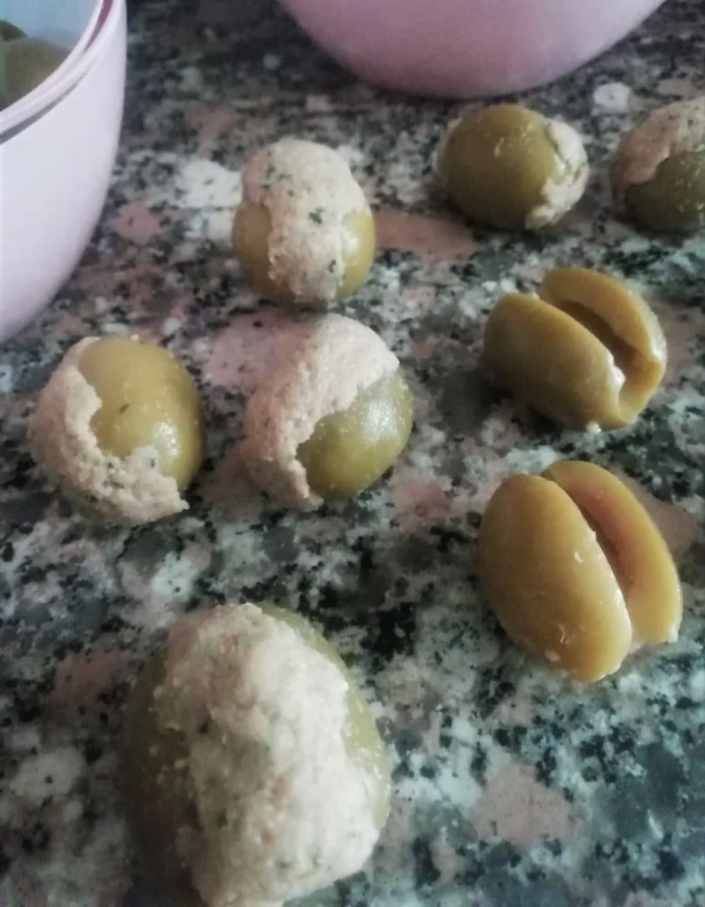 Bereid de grote groene ontpitte olijven voor door ze onder stromend water te wassen, snijd ze vervolgens verticaal in het midden en vul ze stuk voor stuk met de tonijnvulling.
